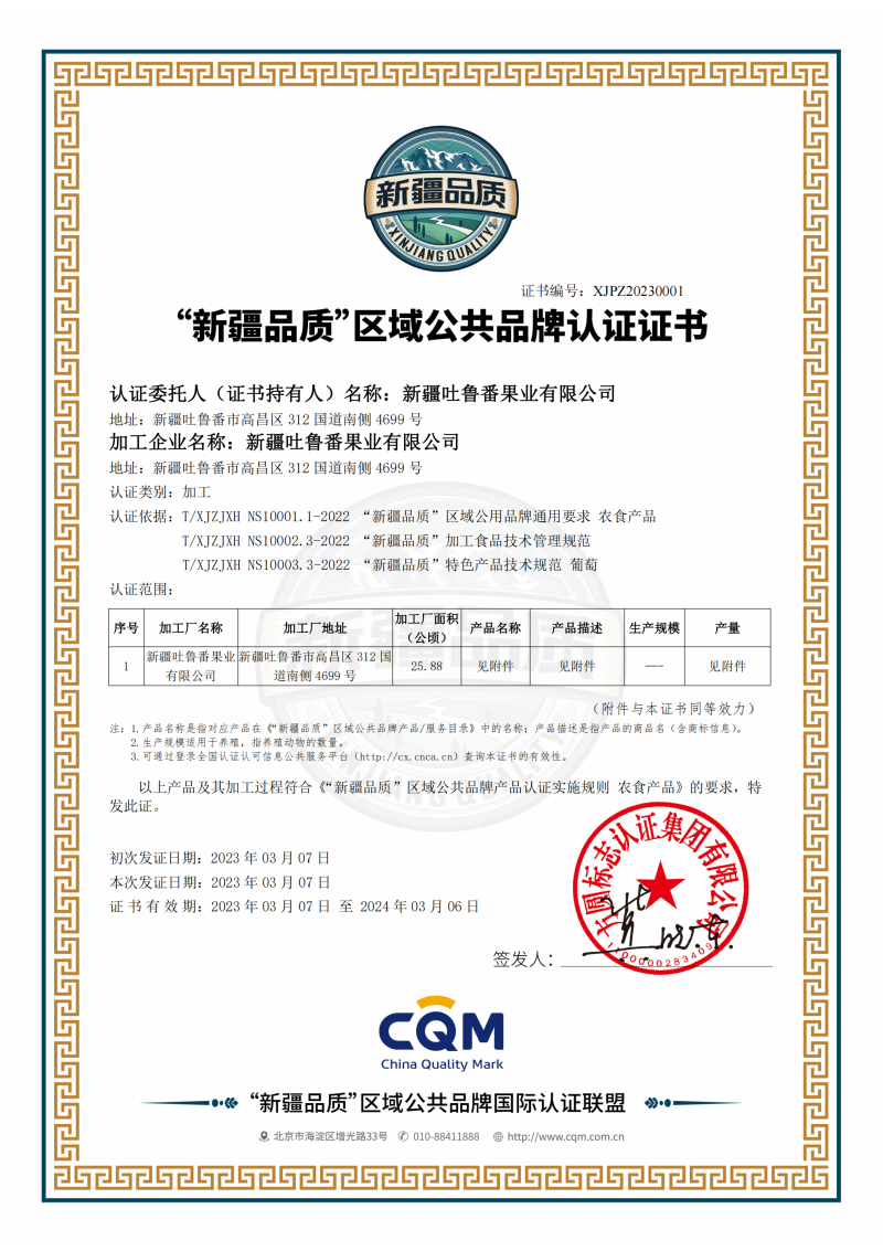 圖為新疆吐魯番果業(yè)有限公司獲得的“新疆品質(zhì)”區(qū)域公共品牌認(rèn)證證書。